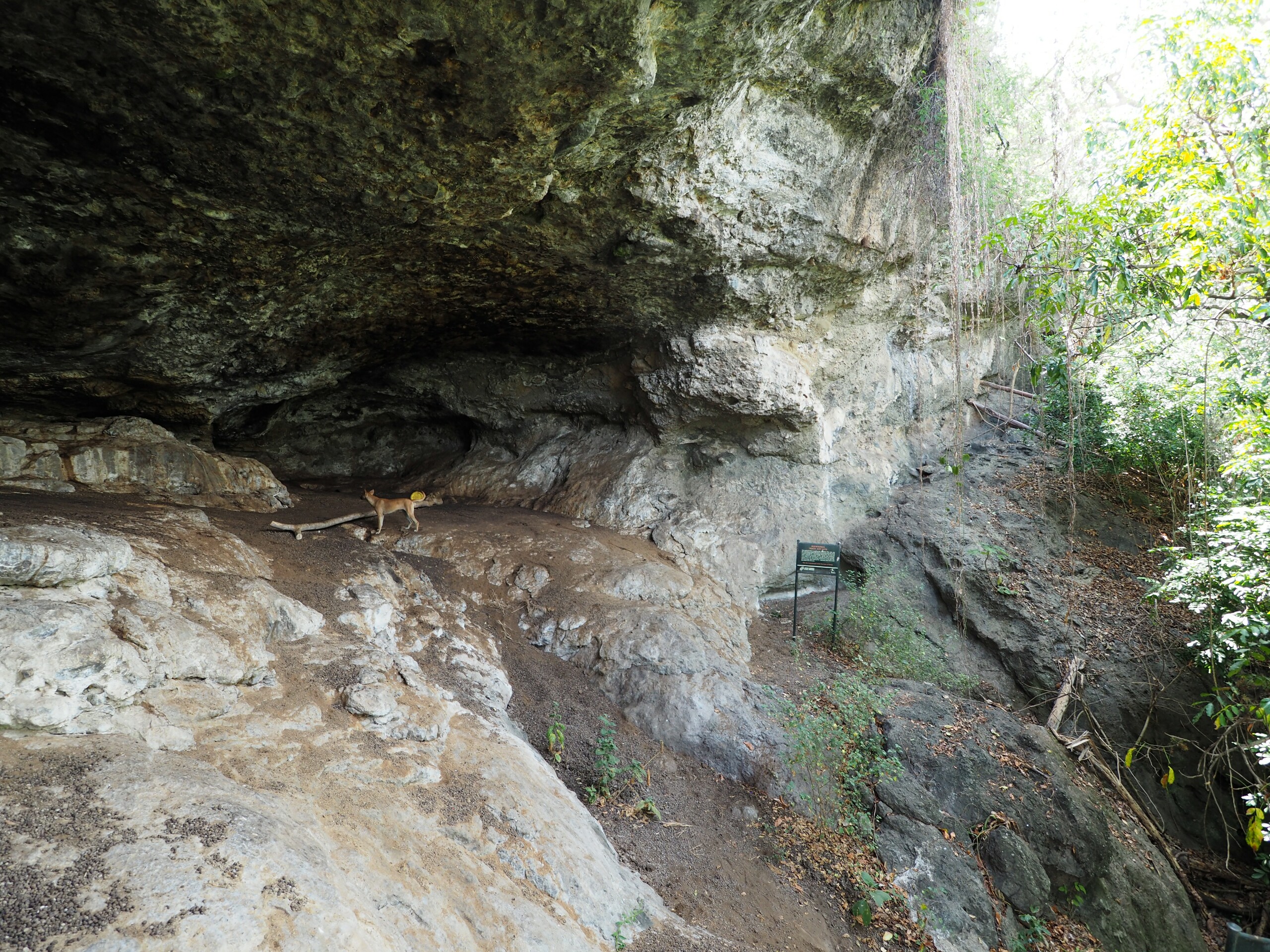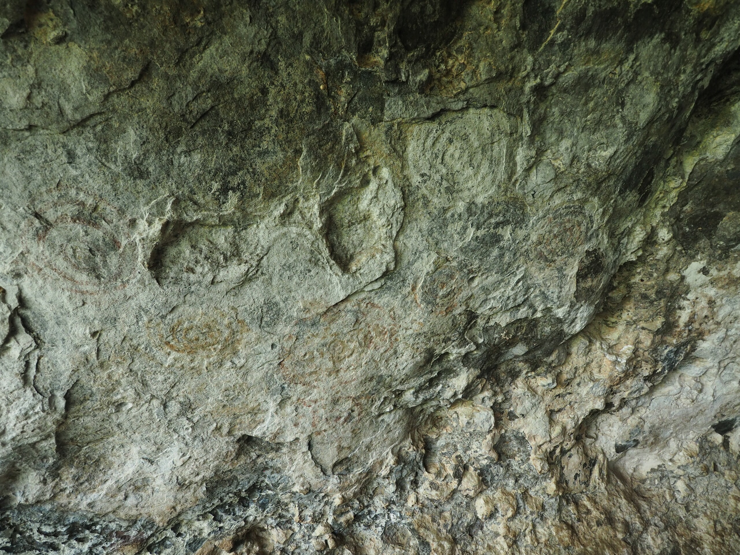 Diese hat uns Katherine wärmstens ans Herz gelegt, wobei das spektakulärste eigentlich die Anreise ist. Es geht mit dem Motorrad über Stock und Stein, wir müssen teilweise absteigen, um weiterzukommen und die letzten Meter geht es dann nur noch zu Fuß erst zum See und dann wieder hoch in eine Höhle, wo die Malereien zu finden sind. Diese sind eigentlich hauptsächlich deswegen interessant, weil sie so schwer zu erreichen und auch überhaupt nicht vor der Witterung (und den Besucher:innen) geschützt sind. Obwohl sie dementsprechend ausgewaschen sind, ist es doch erstaunlich, dass sie schon 1000-4000 Jahre überlebt haben!