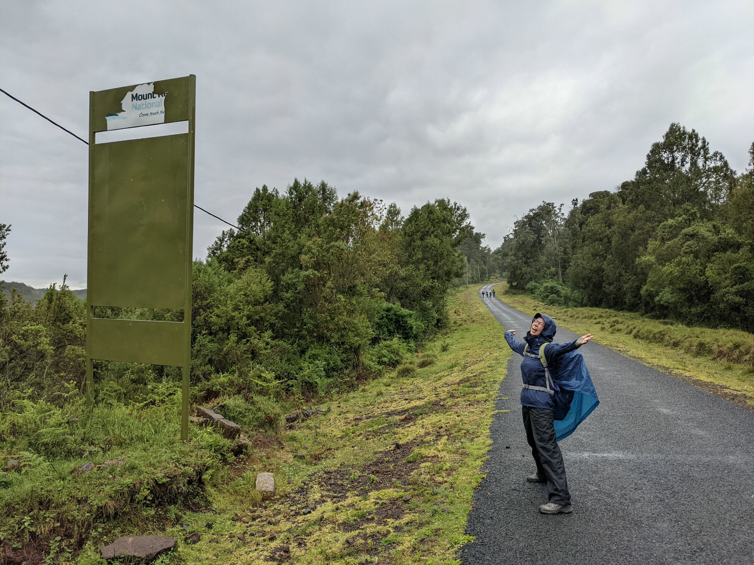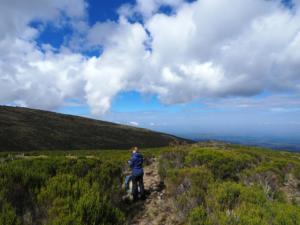 Am ersten Tag überqueren wir zu Fuß den Äquator und übernachten auf 3300m Höhe, bevor es am zweiten Tag rund 7 Stunden zum Basecamp auf 4200m geht. Eine herrlich idyllische Hütte und wir sind froh einen kompletten Tag Akklimatisierung auf der Hütte eingeplant zu haben, denn es ist einfach nur schön hier. Kerstin plagt zwar nach der ersten Nacht die Höhenkrankheit, aber da das Wetter am Morgen sowieso verregnet ist, warten wir geduldig auf ein wenig Sonnenschein bevor wir am Nachmittag – nachdem es Kerstin etwas besser geht – einen ersten Aufstiegsversuch wagen. Eldad beweist tolles Fingerspitzengefühl mit Kerstin, er befürchtet, dass der eigentliche Aufstieg am nächsten Morgen um 3 Uhr zu anstrengend für sie wird. Er möchte aber, dass sie den Gipfel auch schafft und so bittet er einen der Träger “Jackson” mitzukommen und wir stiefeln zu viert auf den Berg. Tobi geht mit Jackson etwas voraus und so schafft Kerstin geführt von Eldad ohne Stress nach knapp 3 Stunden die letzten 800 Höhenmeter und 3km Strecke auf den Gipfel. Da eigentlich alle Touren immer zum Sonnenaufgang auf den Berg gehen, sind wir oben auch ganz alleine und können die trotz Wolken immer wieder durchblitzende Aussicht genießen.