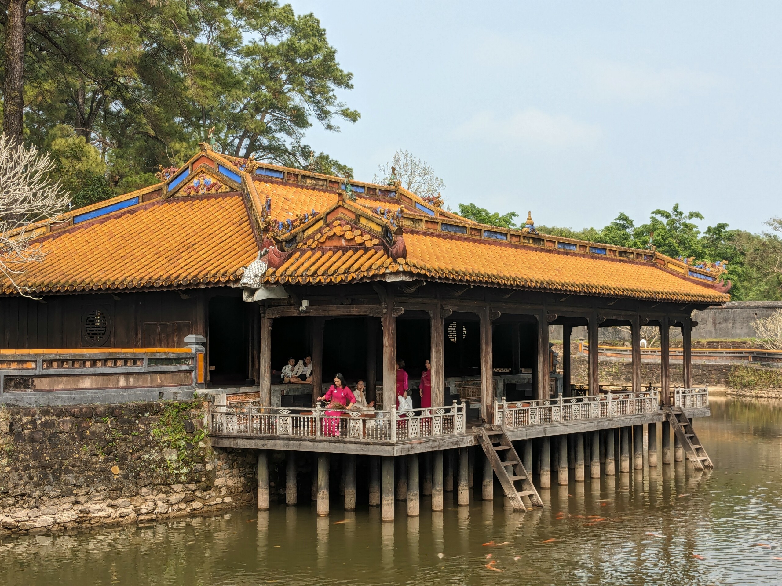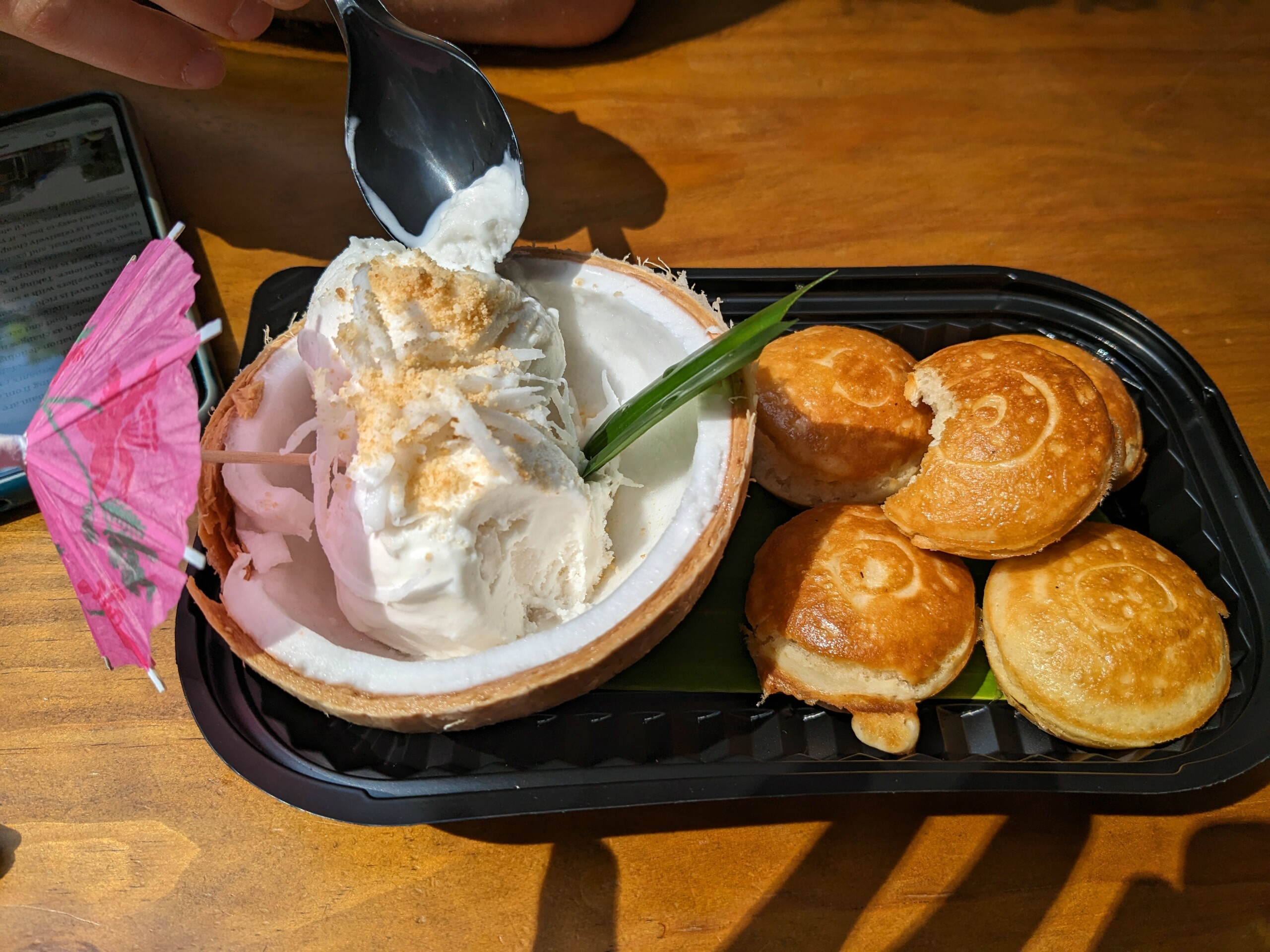 For the last stop on the tour – a rice noodle factory – we take another short boat trip. Here we learn how rice flour and water are first briefly fried into 80 cm diameter rice sheets, then dried for several hours and finally cut into fine rice noodles. We also get a “rice noodle pizza” to eat on the way! On the way back to the hotel, we drive through another, much larger floating market. The boats here are larger and loaded with huge quantities of goods. It’s like a wholesale market on the water. This is where the traders living on the boats come to sell the goods they have bought from the farmers. Back at the hotel, we say goodbye to Clara and receive a small New Year’s gift – an envelope with freshly printed money, which also brings luck and success in the coming year – which we are told to open on New Year’s Day.