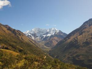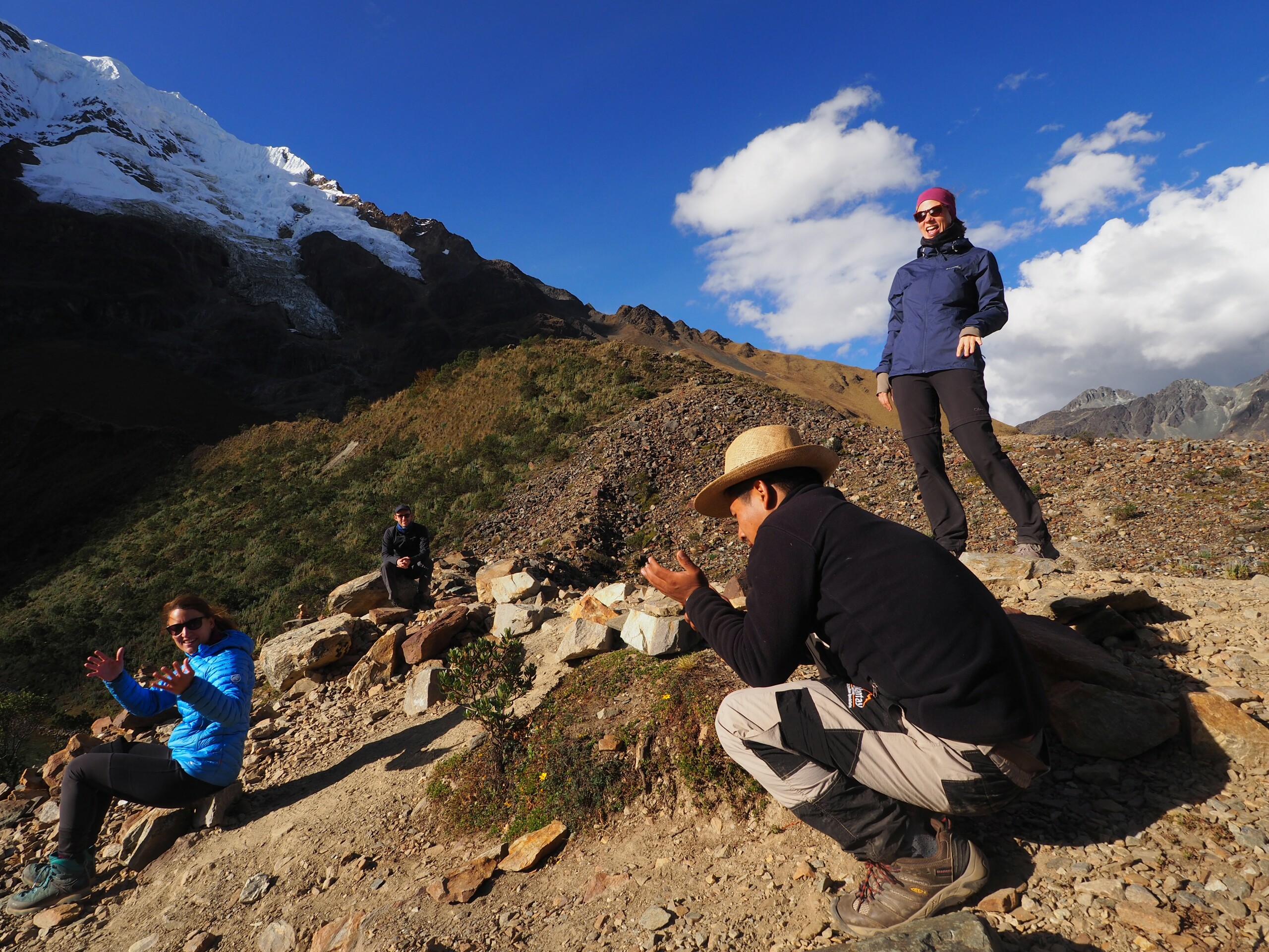 Am Morgen werden wir (wie auch die folgenden Tage) mit Coca-Tee geweckt, den Blättern der Pflanze aus der Kokain gewonnen wird und der sowohl wach macht als auch gegen die Höhe helfen soll (wir hoffen mal dass wir in Europa nicht in einen Drogentest verwickelt werden, das Zeug lässt sich wohl 3 Monate nachweisen…). Nach dem Frühstück geht es dann los auf den Pass und wir schaffen es alle in rund drei Stunden nach oben an den Fuß des Salkantay Gletschers. Einfach ein wahnsinniger Ausblick und ein tolles Gefühl den höchsten Punkt der Wanderung erreicht zu haben, ab jetzt geht es nämlich hauptsächlich bergab, um genau zu sein, erstmal 1400m zu unserem nächsten Camp.