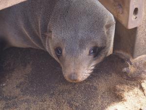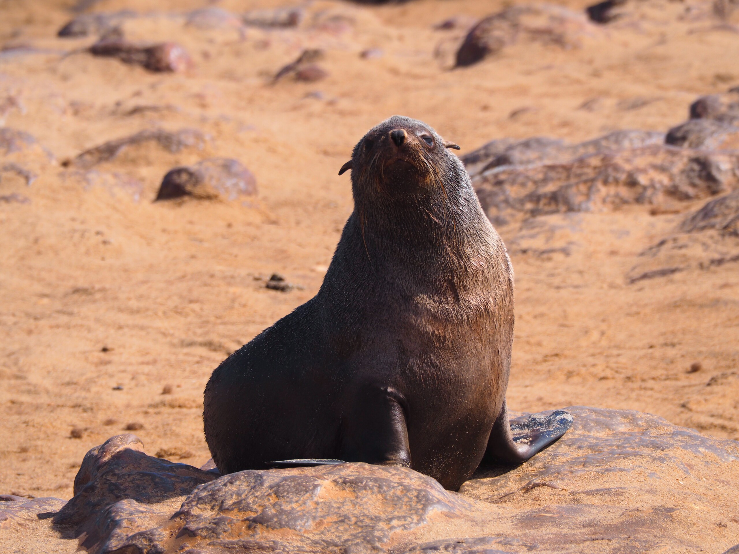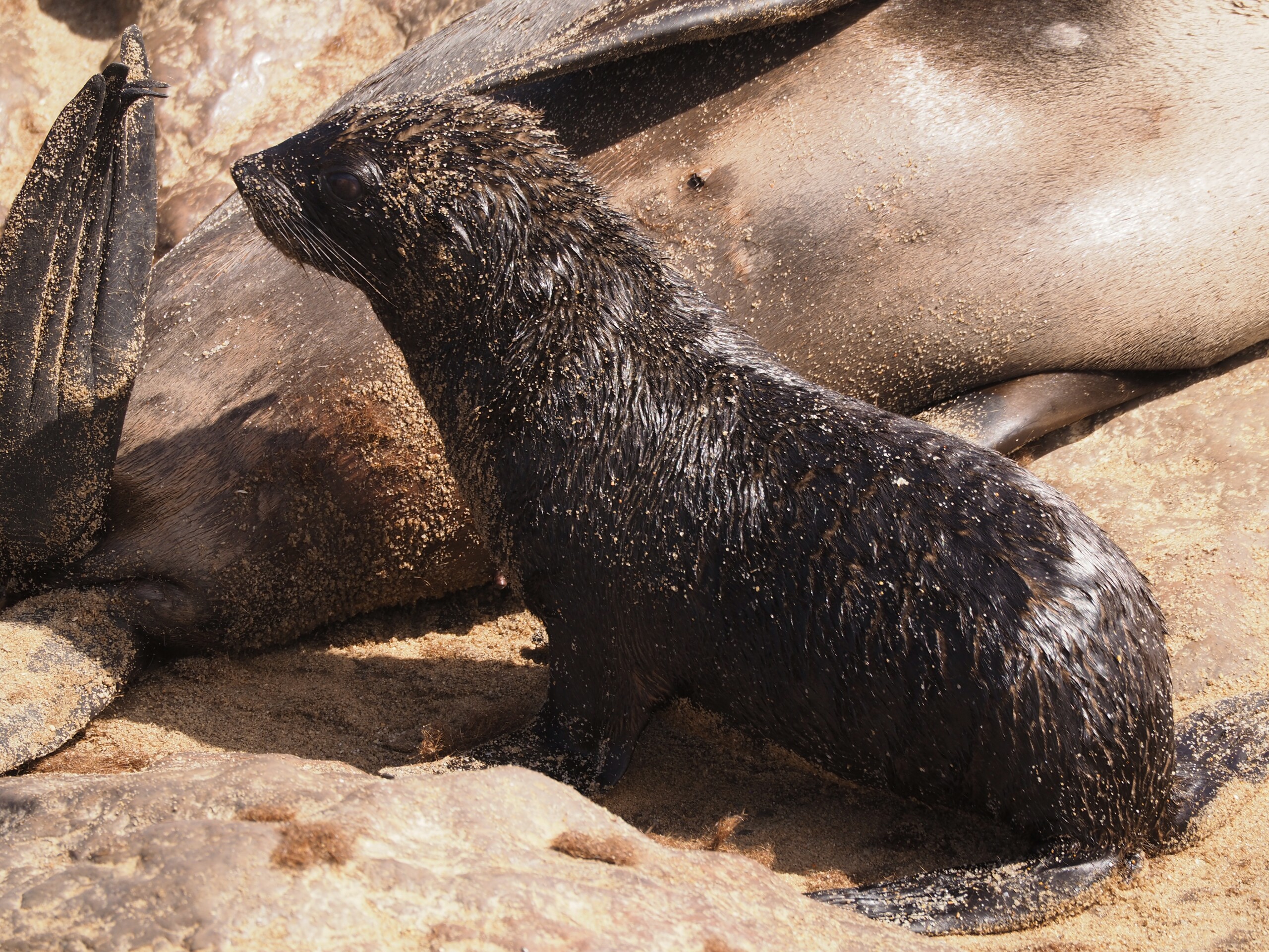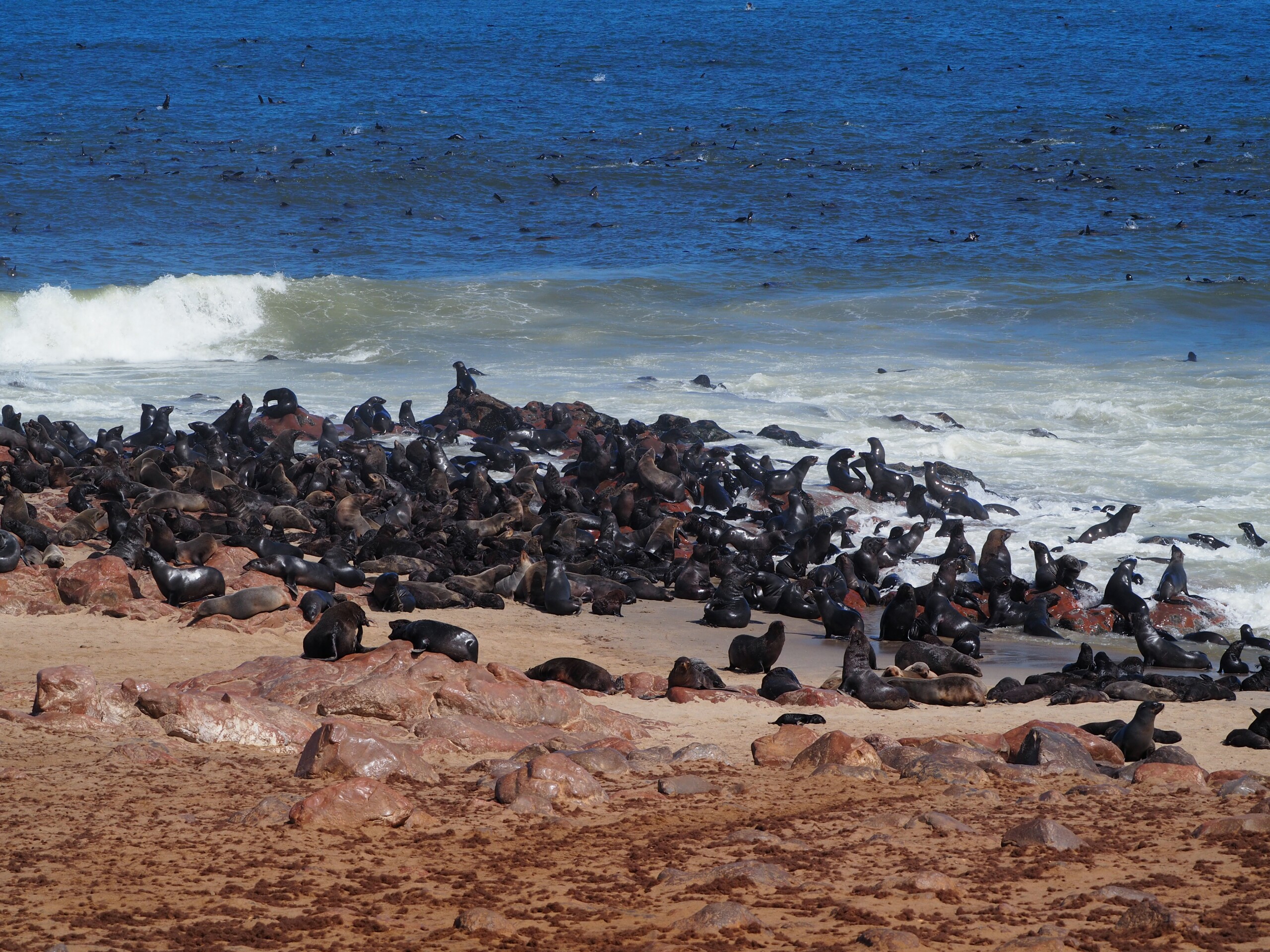 For us much more interesting is the nearby seal colony – more precisely: dwarf fur seals – at the “Cape Cross”, which can be visited for a small entrance fee. Here hundreds of thousands of female seals cavort with their offspring, now about 4-5 months old – the males only come to the coast during the mating season in October. At first we are greeted by an acrid stench and we briefly consider using our FFP2 masks for other purposes, but our noses quickly get used to it. And so we stroll for about an hour over the wooden footbridge through the colony and observe the seals from partly very close. Some sleep under the jetty, thousands cavort on the beach and in the water, we see first swimming exercises of young seals, nursing mothers and a small one on mother search – one would like to take it most dear in the arm and comfort . The mass of seals and the impressions associated with them are simply overwhelming!!!
