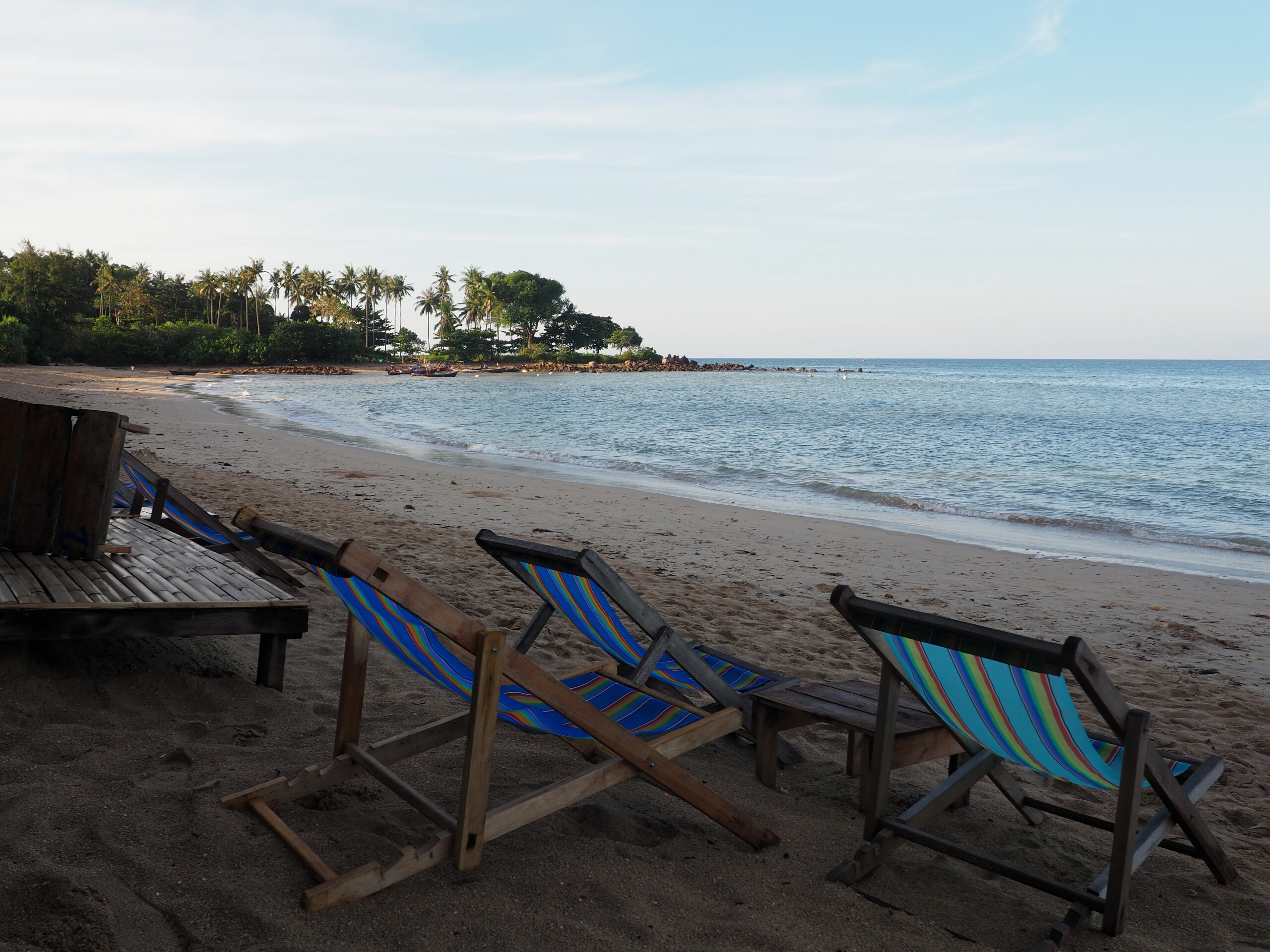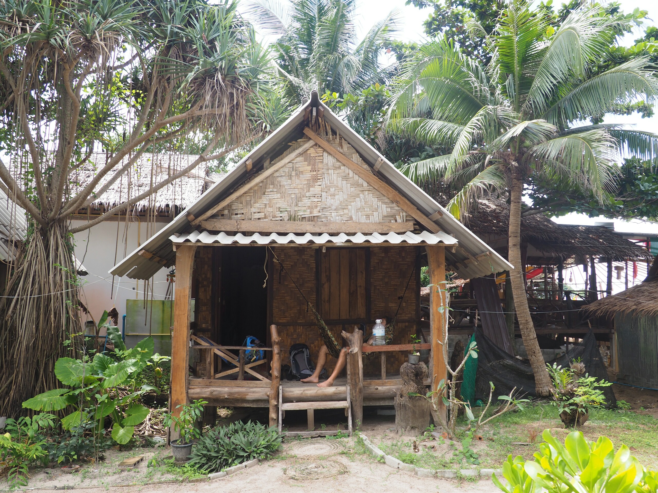 Nach unserer Ankunft mit der Fähre ging es erstmal ca. 20 Minuten mit einem Tuk-Tuk zu unserem Hotel, wo wir uns in einem Bambus-Strandbungalow eingemietet hatten. Leider waren wir so früh da, dass wir ca. eine Stunde mit einer Kokosnuss am Strand warten mussten. So ein Mist Und die Managerin des Hotels ist einfach nur goldig. Selbst für thailändische Verhältnisse, wo es echt schwer ist unsympathische Menschen zu treffen, war sie einfach der absolute Hammer. Ihr Lieblingssatz: “Relax at the beach, I call you when it’s ready”. Man hätte sie einfach jedes Mal in den Arm nehmen können, wenn wir sie um irgendwas gebeten haben, sei es Wäsche waschen, Rollerverleih, Bootsbuchung oder als sie uns am Ende mit Tobi’s verlorener Kreditkarte geholfen hat. Die Kreditkarte ist zwar verschollen geblieben (vermutlich von irgendeinem ATM gefressen worden), aber das war am Ende auch nur halb so schlimm.