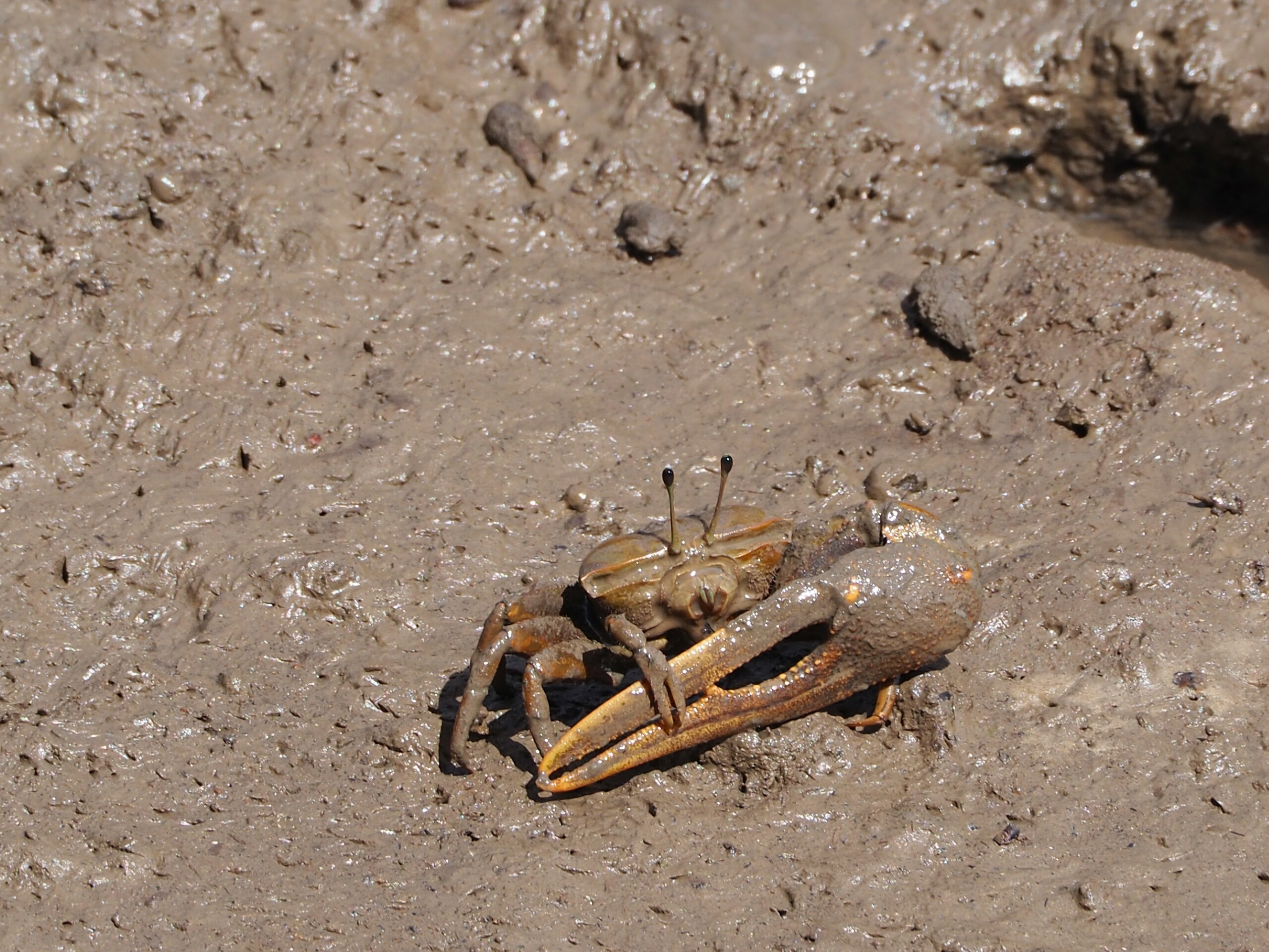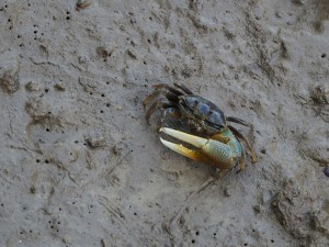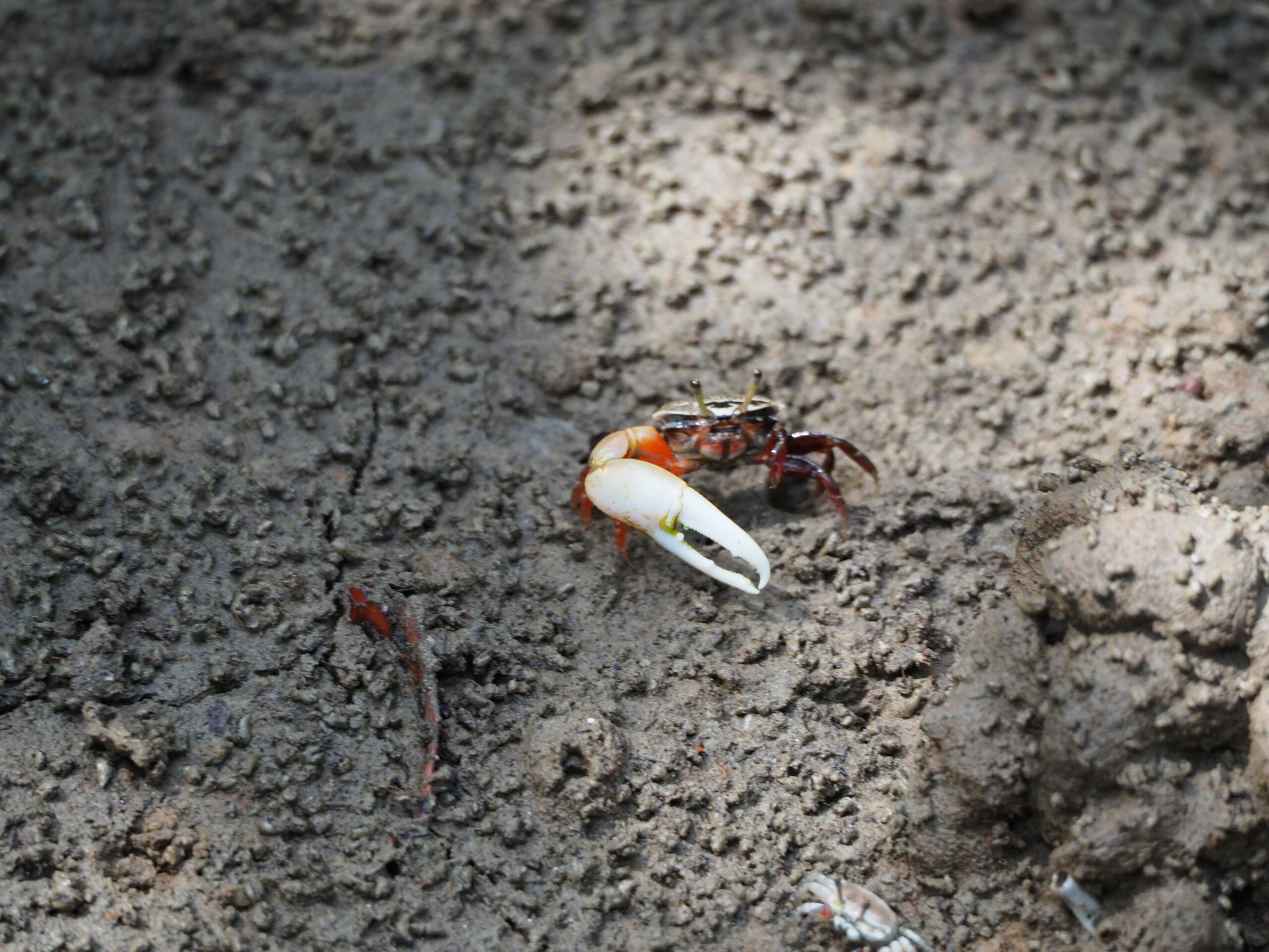 Koh Lanta selbst erkundeten wir wieder mit einem gemieteten Roller. Die Insel hat einige schöne, wenn auch nicht übermäßig spektakuläre Strände zu bieten. Daher war unser persönliches Highlight der Besuch des Mangrovenwaldes im Osten der Insel. Nicht unbedingt wegen den Mangroven, die haben wir ja mittlerweile schön öfters bewundert, sondern wegen der Vielzahl an Krebsen, die es sich hier gemütlich machen und bei Ebbe toll zu beobachten sind. Besonders angetan haben es uns einige Einsiedlerkrebse und die Krebse mit nur einer, dafür aber riesigen Schere. Wir konnten sogar einen kurzen Kampf zwischen zwei besonders großen Exemplaren beobachten! Der Nationalpark Koh Lantas und dessen “Jungle-Walk” ist leider sehr unspektakulär, aber man zahlt das Eintrittsgeld ja auch für den Naturschutz. Auch wenn es beim Rückweg schon spät war, wollten wir trotzdem noch einen kleinen Abstecher zu einem etwas abgelegenen Wasserfall machen. Wir mussten zwar nach 20 Minuten umdrehen, da wir es sonst nicht vor Einbruch der Dunkelheit aus dem Dschungel geschafft hätten, aber auf dem Weg erspähten wir eine schlafende Schlange in einem Baum nur wenige Meter von uns entfernt. Ein bisschen mulmig wird einem bei dem Gedanken schon, dass die auch direkt über einem sitzen (und im Zweifel runterfallen) könnte