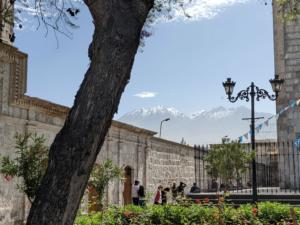 Nach ein bisschen frischmachen im Econunay-Hostel vertreiben wir uns die Zeit bis unser Zimmer frei wird mit einem ersten Spaziergang durch die Stadt, und sie lädt einfach zum Bleiben ein. Unzählige kleine Cafes, viele von Immigranten betriebene internationale Restaurants in Innenhöfen oder auf Dachterrassen mit wunderschönem Ausblick auf die 3 Vulkane (Misti, Pichu Pichu und Chachani), die die Stadt umgeben, alles einfach ein bisschen alternativ und mit viel Charme. Wir finden sogar ein kleines veganes Restaurant, in dem wir für 2€ ein 4-Gänge-Menü zum Mittagessen ergattern!