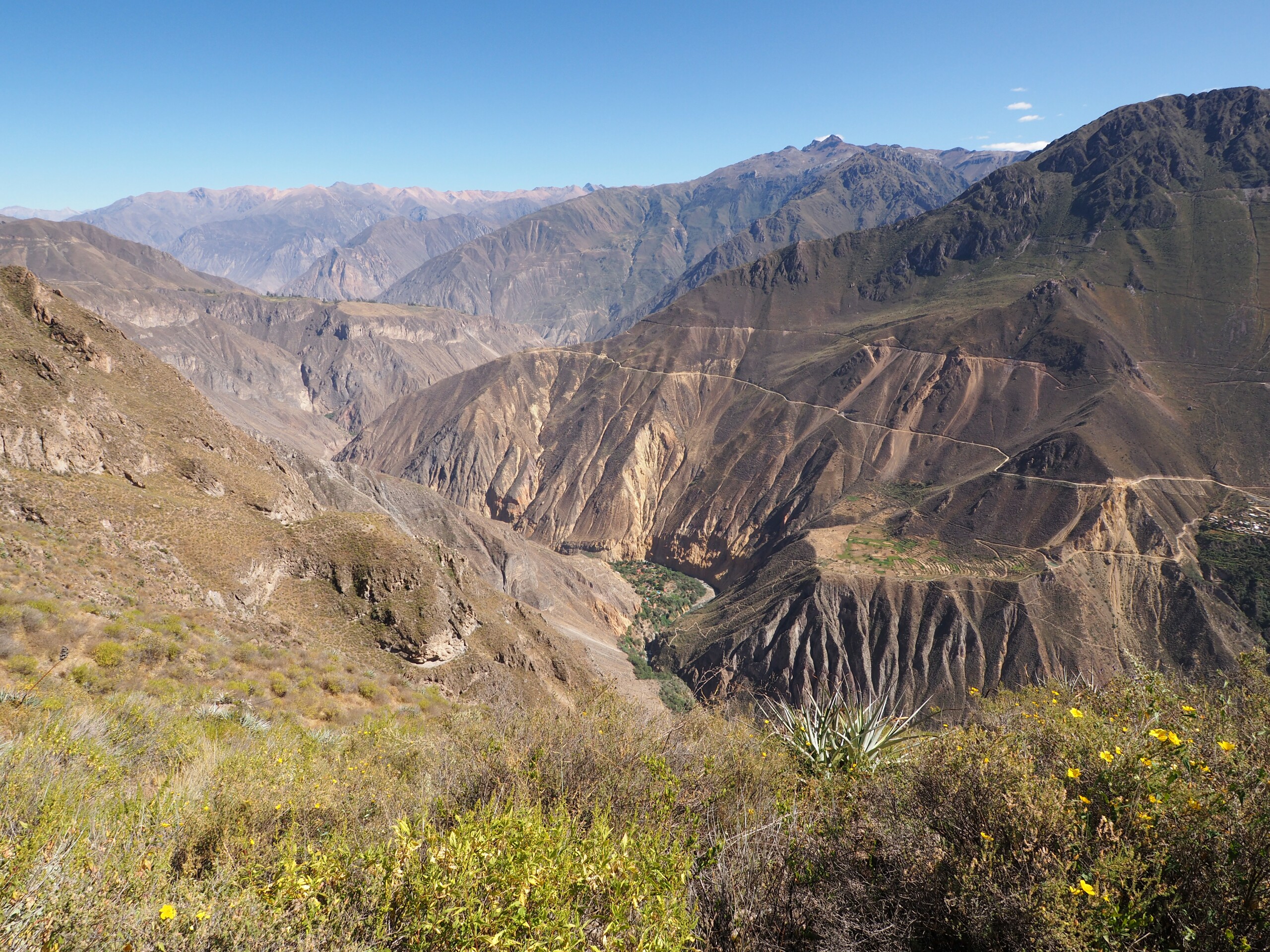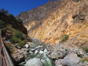 Danach geht es weiter zum Startpunkt der Wanderung, die uns 1100m in die Tiefe zum Fuß des Canyons führt. Da wir mittlerweile auf 3300m ü.d.M. angekommen sind, merkt man auch langsam die dünne Luft. Dazu kommt eine unglaubliche Hitze beim Abstieg in den Canyon, aber am Ende werden wir mit Schatten, einer kurzen Erfrischung im Fluss und natürlich der unglaublichen Aussicht auf die Steilwände des Canyons belohnt!