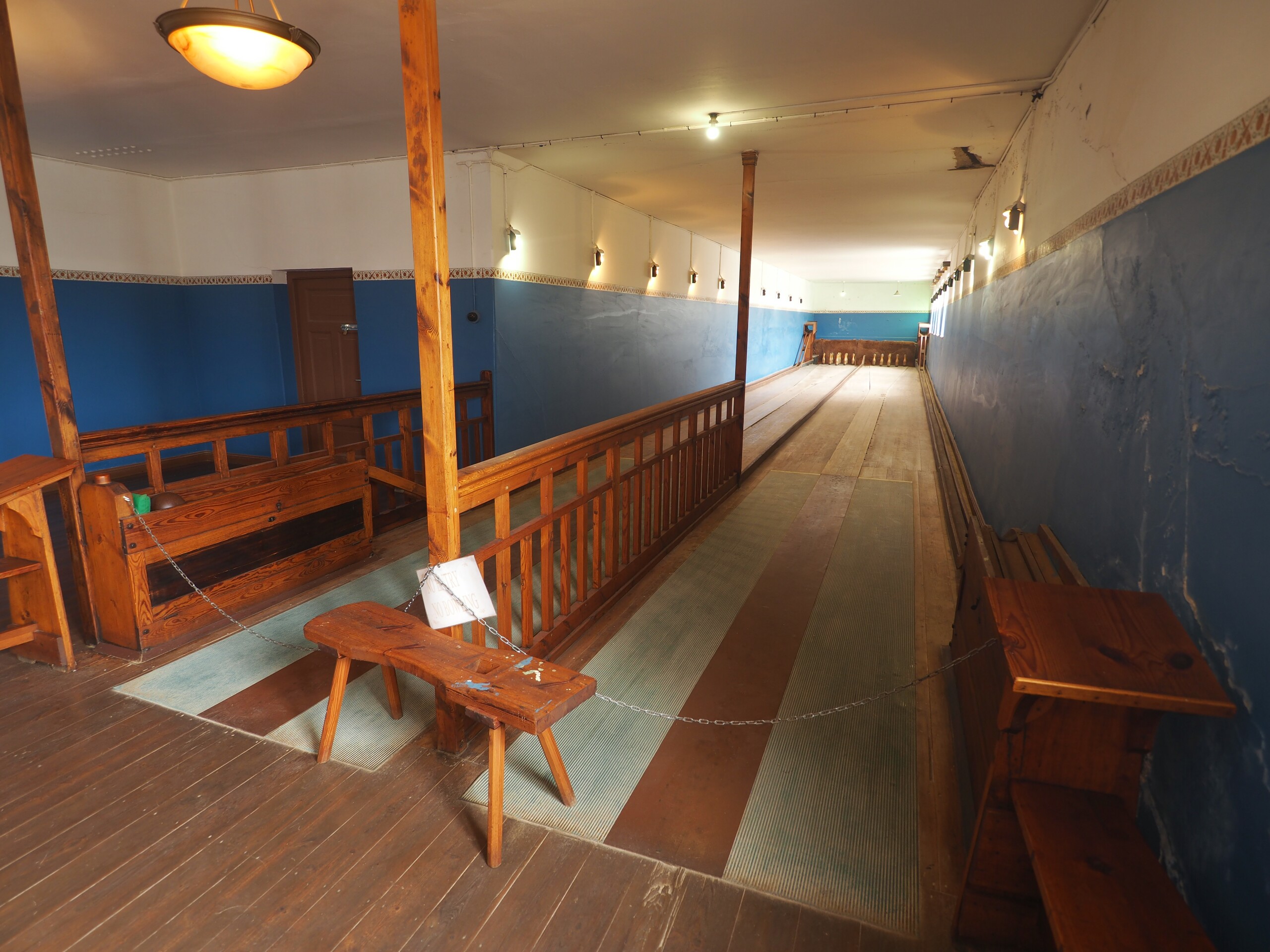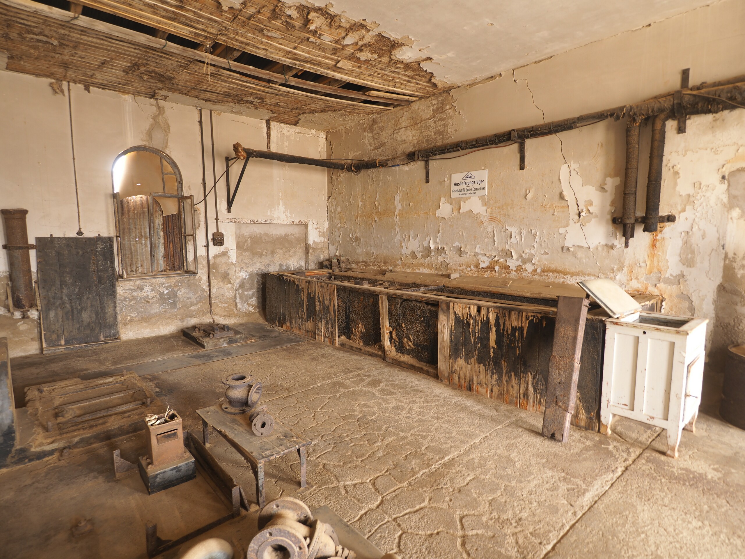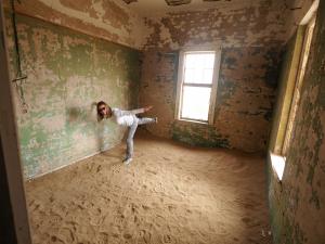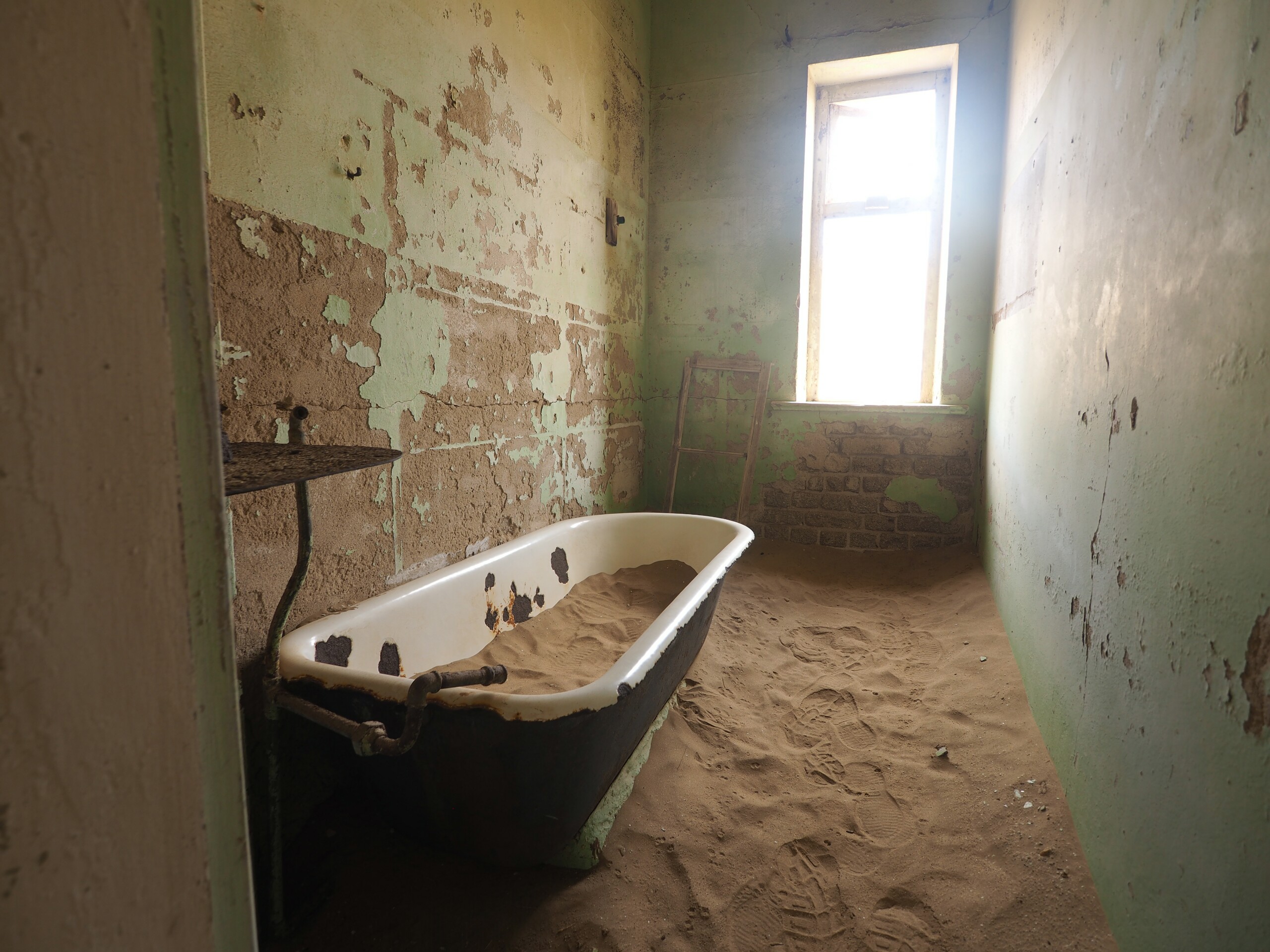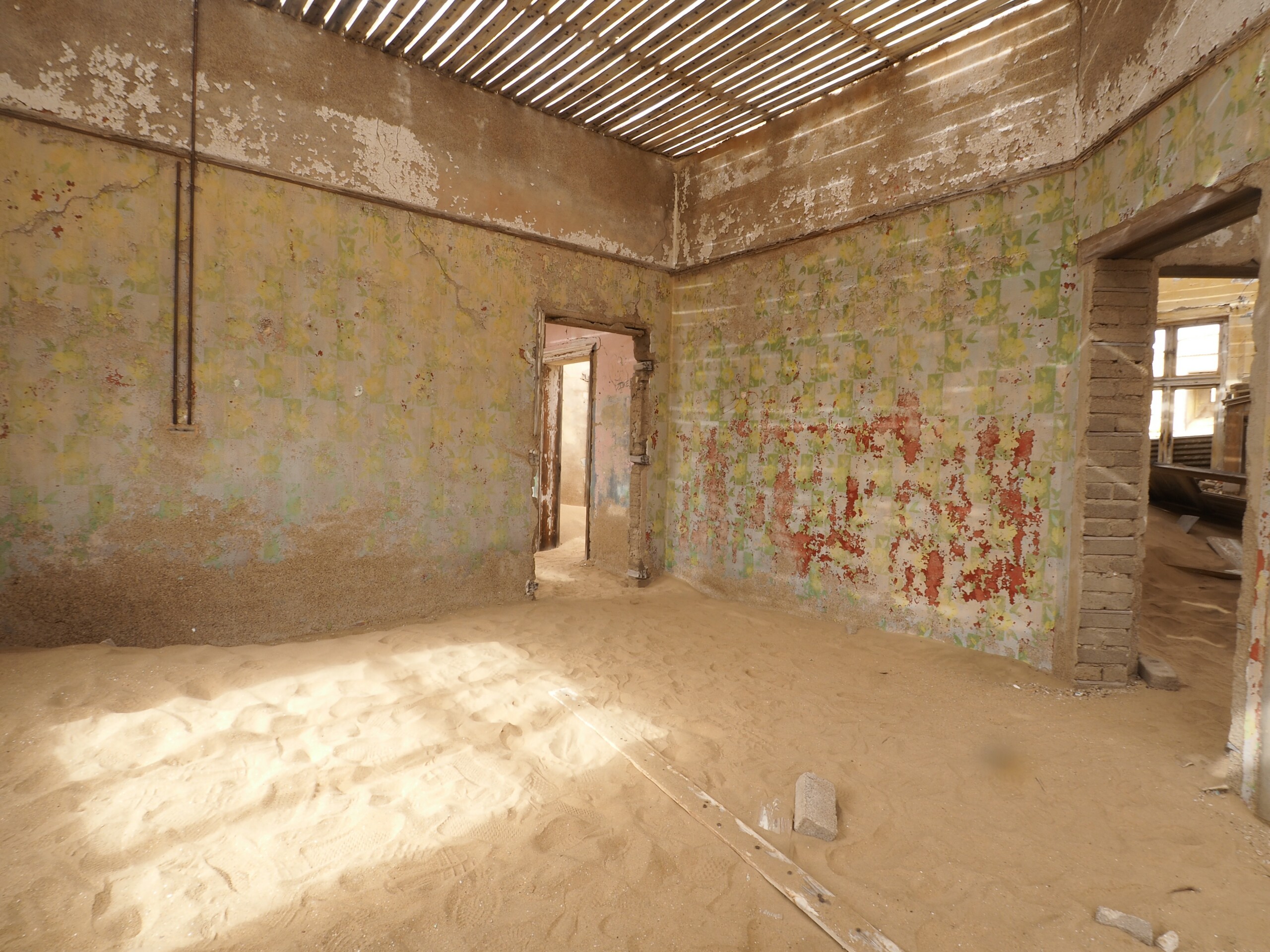 Heute erinnert daran hauptsächlich die Geisterstadt Kolmanskuppe, die bekannteste der damals vielfältigen Bergarbeiterdörfchen mitten in der Wüste, welche heute besichtigt werden kann. Und so stolpert man mitten in der Namib über die Ruinen der deutschen Kultur des frühen 20. Jahrhunderts, über Metzger- und Bäckereiläden, eine Turnhalle mit Reck und Bock sowie eine Kegelbahn mit deutschen Spielregeln an der Wand. Alles recht witzig und mit süßem deutschen Akzent von unserer Führerin erklärt, aber irgendwie ein bisschen zu viel Deutschkitsch für unsere Bedürfnisse. Das beeindruckende kommt eigentlich erst nach der Führung. Wir schlendern durch die langsam verfallenden Häuser, die sich teils mehr teils weniger mit Sand gefüllt haben und genießen das Spiel von Licht und Schatten in größtenteils einsturzgefährdeten Gebäuden. Hier könnte man sich tatsächlich stundenlang rein mit Fotografieren beschäftigen, ständig ändern sich die Lichtverhältnisse an den oft noch gut erhaltenden pastellfarbenen Innenwänden.
