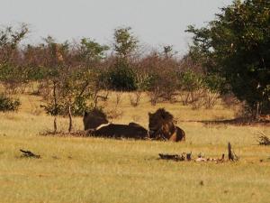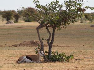 Wir stehen früh auf und fahren zurück zum Wasserloch wo wir die Löwen erspäht hatten, vielleicht sind sie ja noch da. Leider sind sie weitergezogen, dafür entdecken wir eine einzelne Hyäne und drei kämpfende Schakale!!! Bis zum frühen Nachmittag wird das unsere spektakulärste Entdeckung bleiben, dann erspähen wir unter einem Baum einen einzelnen Löwen den wir ein Weilchen beobachten. Irgendwann drehen wir uns um, und hinter uns am Wasserloch sind drei Elefanten aufgetaucht! Wo kamen die denn jetzt her?