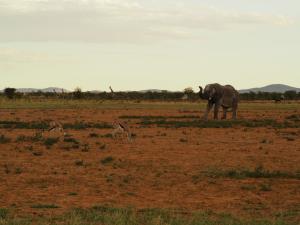 Natürlich nicht, wir entdecken nämlich noch eine riesige Herde Giraffen, die vor uns her galoppieren und wieder Elefanten und Nashörner gemeinsam an einem Wasserloch. Nachts ist hier echt Betrieb und das rote Scheinwerferlicht des Autos – damit die Tiere nicht gestört werden – verleiht der Szenerie eine fast magische Stimmung.