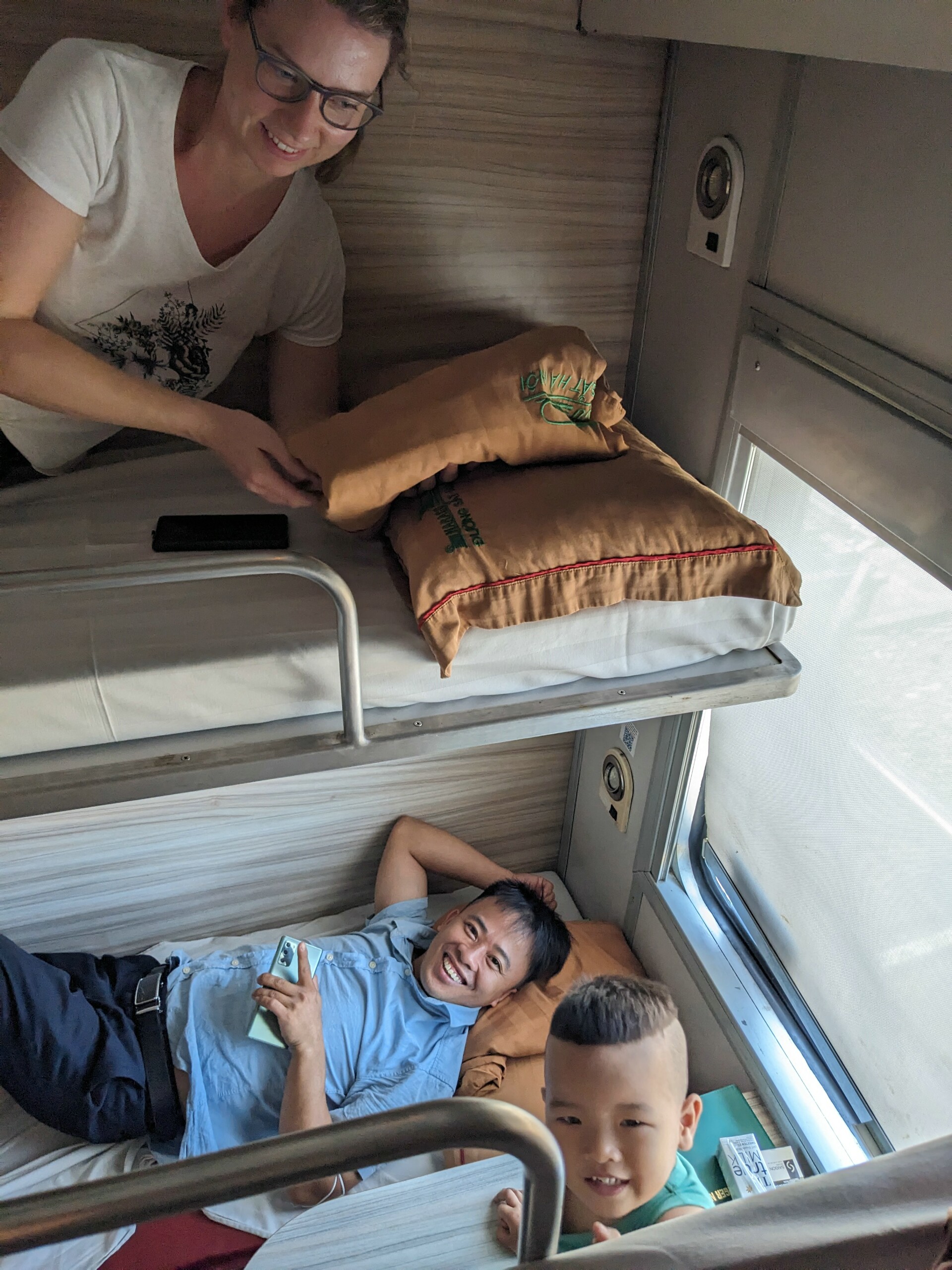 Die 17-stündige Zugfahrt verläuft recht unspektakulär. Bis es dunkel wird, sitzen wir unbehelligt in einem Sitzabteil und begeben uns dann für die Nacht in das Schlafabteil, das wir uns mit zwei vietnamesischen Männern und ihrem Sohn teilen. Die “Betten” sind zwar eher für kleinere Menschen gedacht, aber trotzdem ganz ok, nur typisch asiatisch etwas hart . Leider schläft Kerstin trotzdem fast nicht, und so kommen wir doch relativ müde um 5:20 Uhr am Bahnhof nahe der Hafenstadt Hoi An an und nehmen uns erstmal ein Taxi zum Hostel. Trotz der frühen Ankunft können wir netterweise direkt einchecken und bekommen dadurch nochmal 2 Stunden Extraschlaf!!!