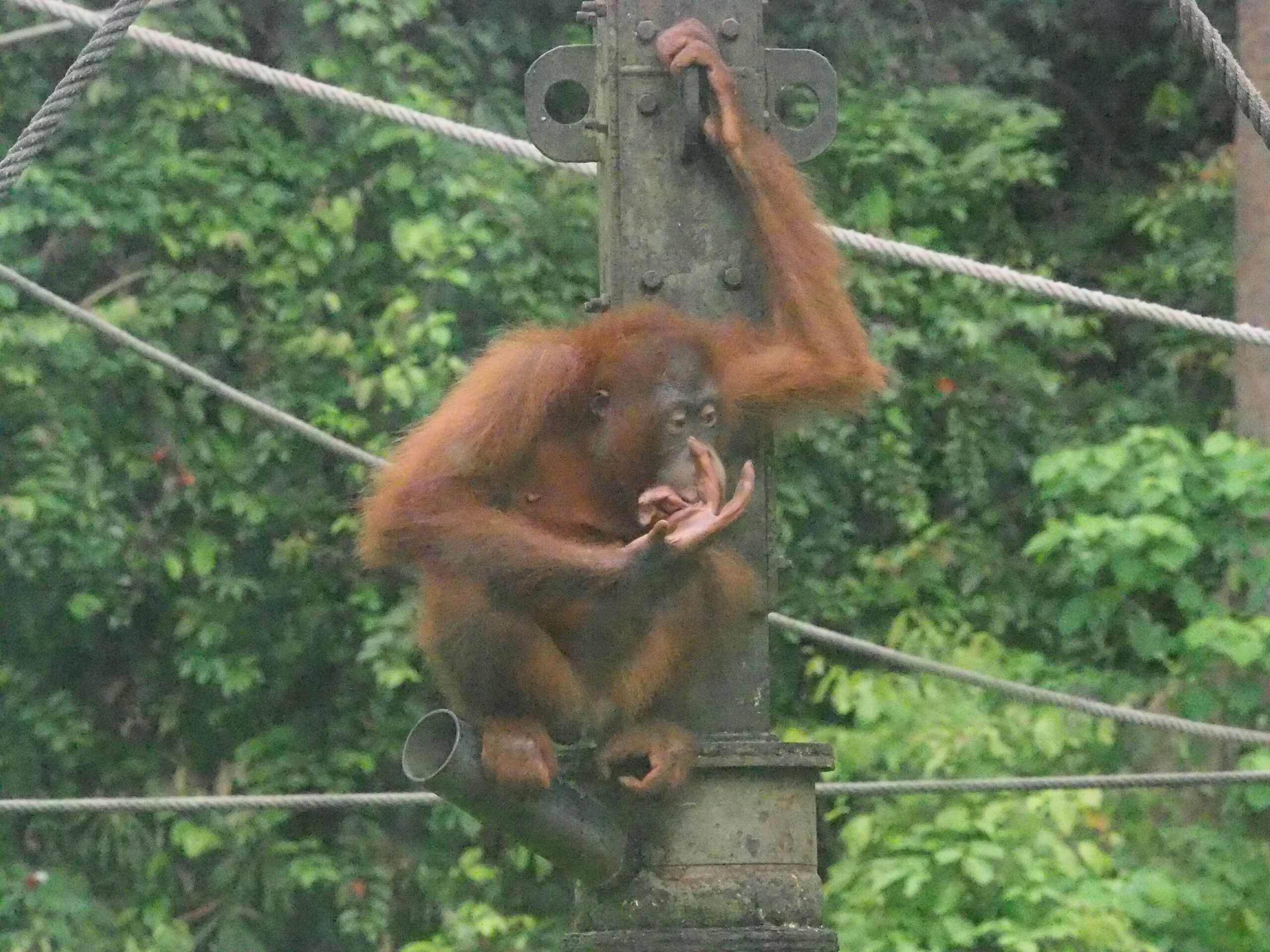 Den Anfang macht eine Auffang- und Auswilderungsstation für Orang-Utans und Malaienbären in Sepilok. Wir werden von einem netten älteren Guide im Hostel abgeholt, der für die nächsten Tage eine Art privater Chauffeur für uns sein wird und einiges an Geschichten zu erzählen hat. Unter anderem war er bei den Expeditionen von David Attenborough als Führer dabei! In Sepilok verbringen wir zunächst einige Zeit mit den Orang-Utans, die hier nach ihrer Ankunft (oder Geburt) schrittweise ausgewildert und am Ende des Prozesses in andere Teile Borneos oder Indonesiens gebracht werden. Zu bestimmten Zeiten gibt es Futter für die Tiere und als Tourist darf man in diesen Zeiten den Park besuchen. Die Tiere kommen und gehen wie sie möchten, bekommen sukzessiv weniger Futter und lernen sich in den Wäldern selbst zu versorgen. Unter anderem gibt es auch einen “Kinderbereich” für die kleinen Ankömmlinge… Direkt neben den Orang-Utans gibt es eine kleine Auffangstation für Malaienbären, die wir ebenfalls kurz besuchen. Die Bären sind als Glücksbringer beliebt und werden häufig als Haustiere in Käfigen eingesperrt. Nach behördlichen Durchsuchungen (oder Einsicht der “Besitzer”) werden sie hier aufgepeppelt und wenn möglich ausgewildert. Auch hier kann man die süßen tapsigen kleinen Bärchen während der Fütterungszeiten besuchen. Beides natürlich kein Wildtiererlebnis und schade, dass es solche Stationen überhaupt benötigt, aber beide Stationen machen für uns einen äußerst professionellen und aufs Tierwohl bedachten Eindruck, und es ist ein schönes Erlebnis abseits der Dschungelpfade