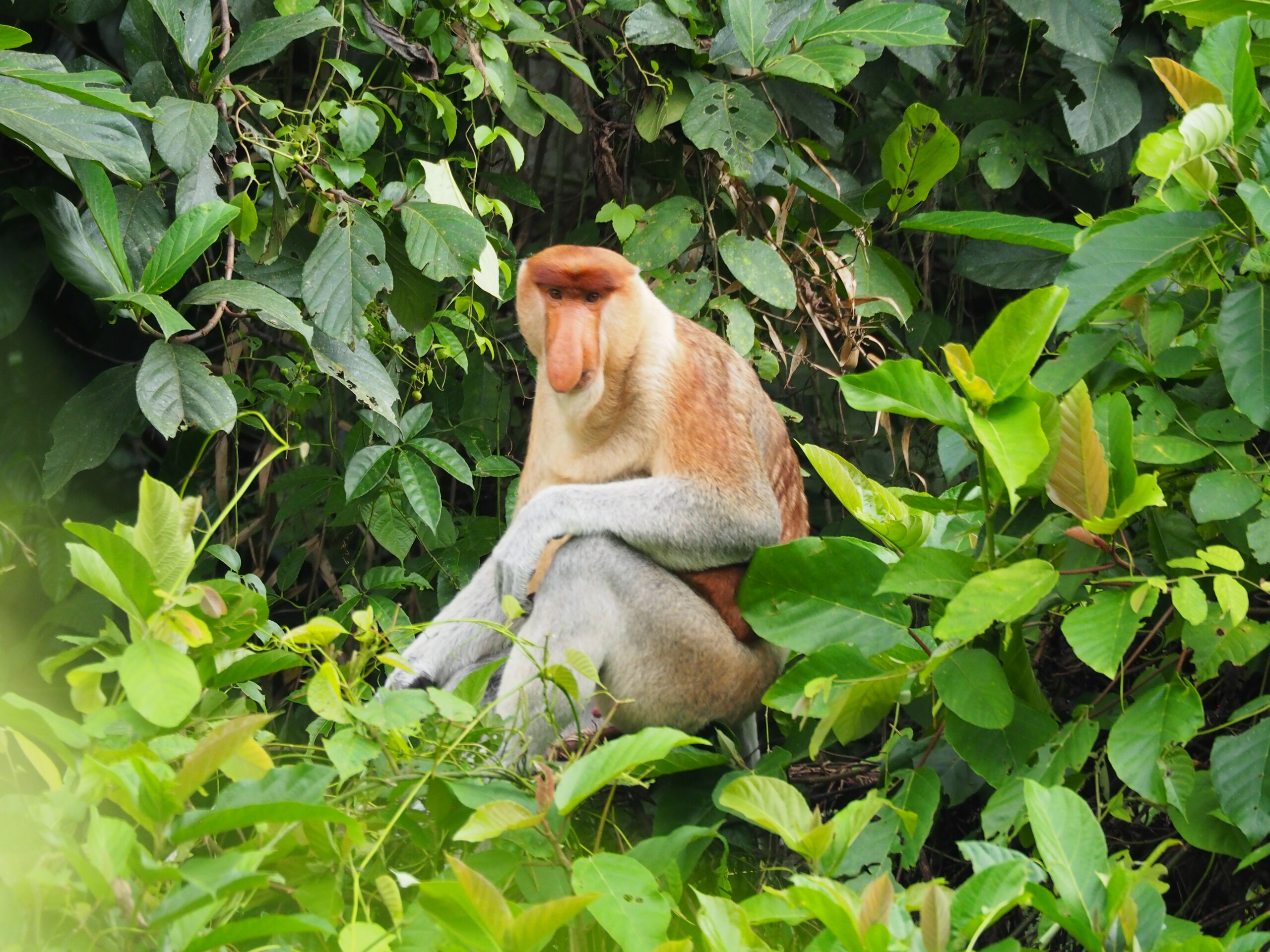 Hierhin geht es nämlich als nächstes. Unser Fahrer fährt uns zu einem kleinen Örtchen, zwei Stunden abseits der meisten Zivilisation, wo wir für die nächsten 2 Nächte bleiben werden. Der Fluss “Kinabatangan” ist nur wenige hundert Meter von unserer Lodge entfernt und so verbringen wir die beiden Tage auch hauptsächlich auf dem Fluss. Bevor es aber losgeht, sehen wir während des Mittagessens einen großen männlichen Nasenaffen. Zunächst sitzt er auf einem Baum auf der anderen Straßenseite der Lodge, findet dann aber an einem Busch gefallen und posiert für ein Weilchen für unsere Fotos! Wir dachten die wären schwieriger zu sehen Am ersten Nachmittag auf dem Boot sehen wir direkt die hier ansässigen Elefanten, die entlang des Flusses nach Schilf suchen, welches sie dann massenhaft vertilgen. Außerdem entdeckt unser Kapitän noch einen Nashornvogel und weitere Nasenaffen – aber bei weitem nicht so nah wie der an der Lodge…
