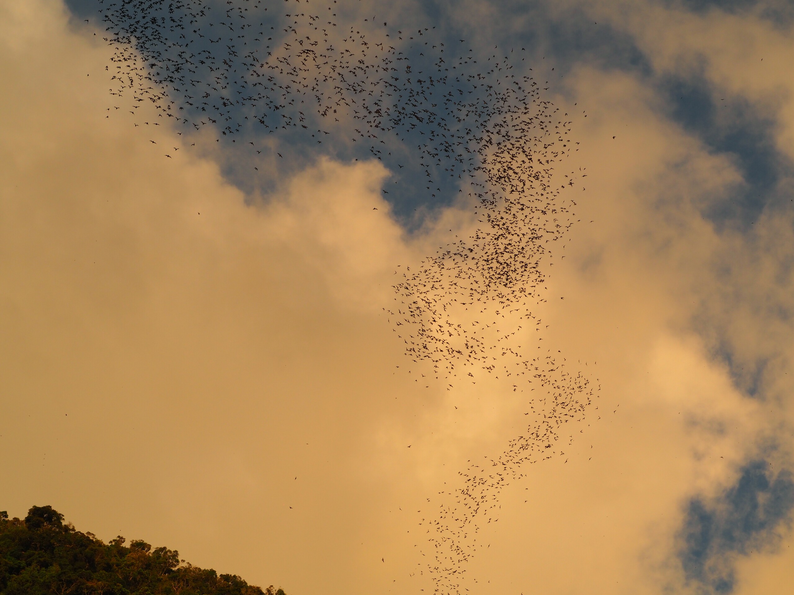 Der Park selbst ist für sein riesiges Höhlensystem (in die Größte davon passen mehrere Airbus A380 hintereinander) und die dort millionenfach lebenden Fledermäuse bekannt. Branda, die Besitzerin unseres Homestays und Frau von James, ist praktischerweise auch lizenzierte Führerin und bringt uns vier am Nachmittag direkt in zwei der bekanntesten Höhlen, die Lang- und Deer Cave. Letztere ist nicht nur riesig, sondern beheimatet rund 3 Millionen Fledermäuse und die Höhle ist an einigen Stellen von ihren Hinterlassenschaften geprägt Nach der Führung bleiben wir noch vor dem Eingang der Höhle und warten auf das abendliche Spektakel der Fledermäuse, den sogenannten “Bad Exodus”. Rund um den Sonnenuntergang sammeln sie sich zunächst in Schwärmen vor dem Eingang, um dann gemeinsam auf die Futtersuche zu gehen und verlassen die Höhle in den bizarrsten Formationen. Es ist wirklich ein unglaubliches Schauspiel und wir entdecken sogar einen Adler der wohl ein Festmahl erwartet…