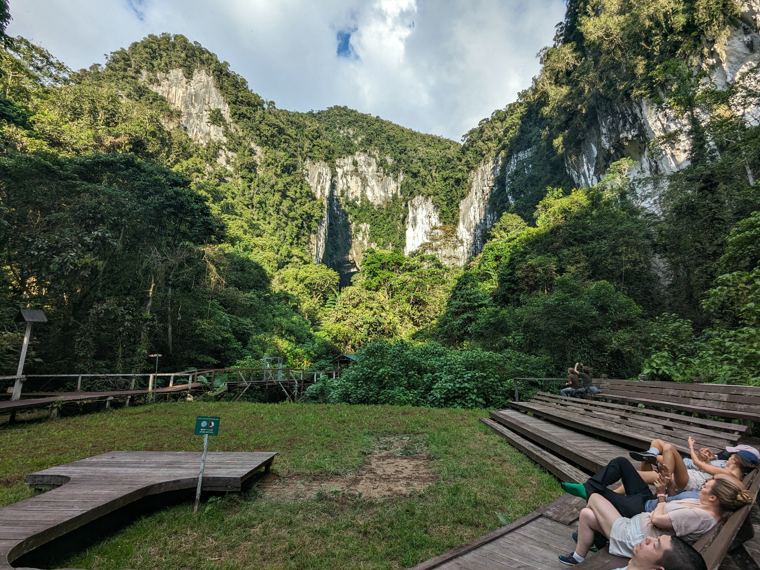 Der Parkeingang ist im gleichnamigen Ort Mulu, aber “Ort” ist fast schon zu viel des Guten. Tatsächlich besteht er aus ein paar Handvoll Homestays, eine große Hotelkette und ein Resort im Park. Wir haben uns für einen günstigen Homestay etwas außerhalb, dafür aber direkt am Fluss entschieden und werden vom Besitzer James auch direkt gemeinsam mit einem weiteren Pärchen, das mit uns im Flieger saß, am Flughafen abgeholt. Und James wird uns auch die restlichen Tage öfter mal durch den Ort kutschieren