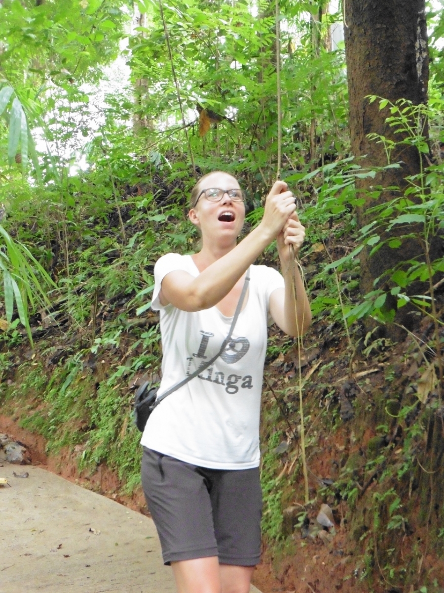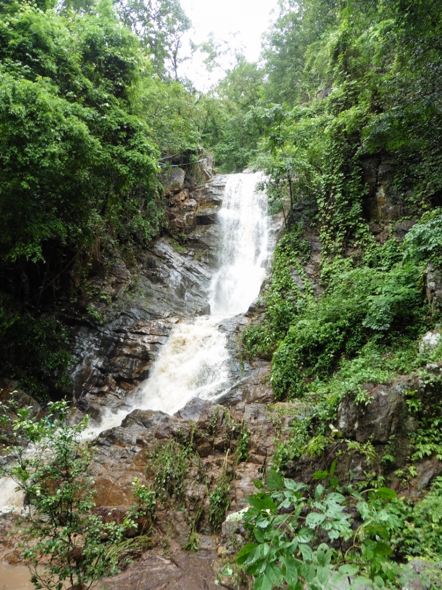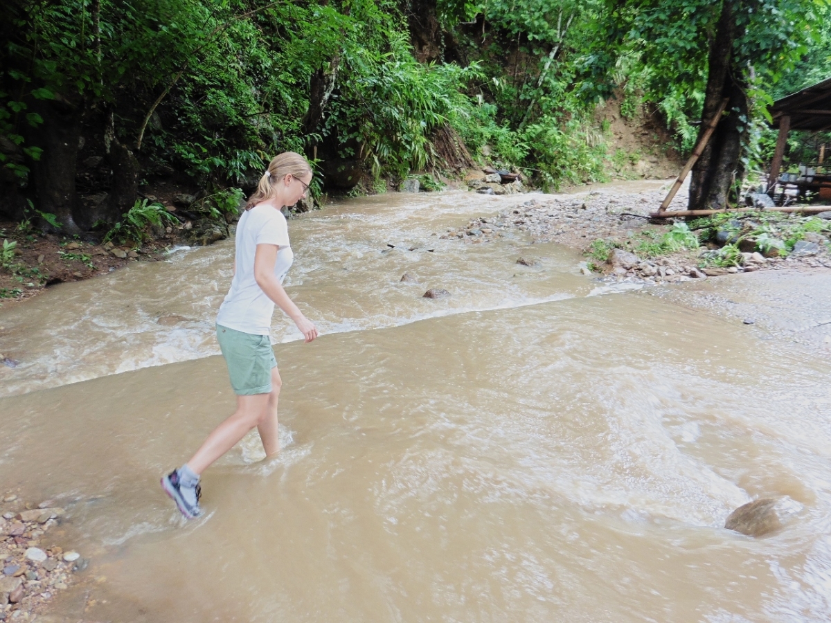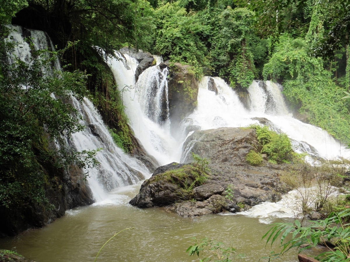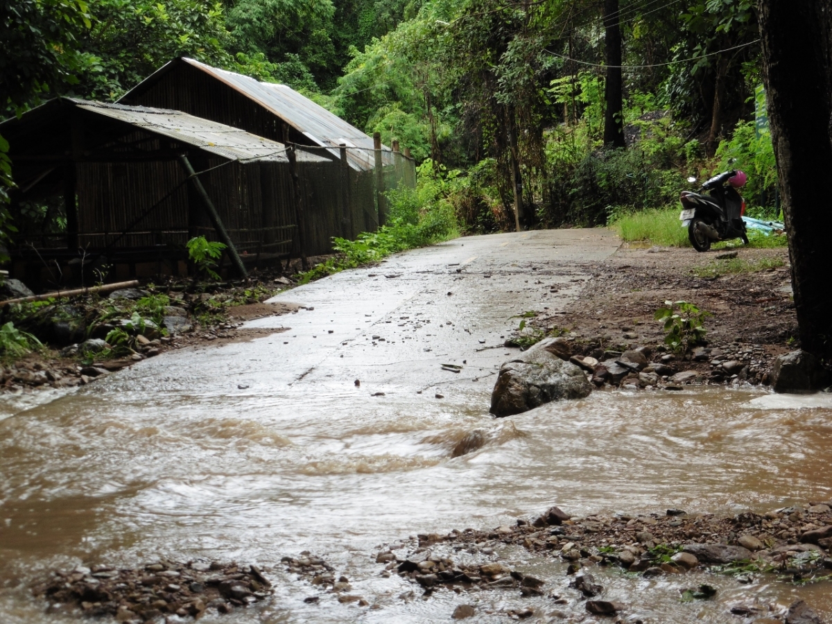 Am nächsten Morgen verfolgten wir dann den gleichen Plan, der auch in Pai schon so gut funktioniert hatte. Roller leihen und raus aus der Stadt. Das stellte sich aber als schwieriger heraus als angenommen, da es scheinbar nur einen Rollerverleih gibt und der will erstmal gefunden werden. Aber nach ein wenig rumfragen (fragen bedeutet in diesem Fall eher Hände, Füße und Google translate) stöberten wir den Verleih auf und konnten uns auf den Weg in den Mae Surin Nationalpark machen. Leider bekamen wir hier zum ersten mal die Nachteile der Regenzeit zu spüren, denn die Straße zur Hauptattraktion – dem „Mae Surin Wasserfall“ – war leider gesperrt. Wir hatten uns aber zwei andere Wasserfälle auserkoren, die wir besichtigen wollten: den Pha Bong und Pha Suea. Die Fahrt zum ersten stellte sich als schwieriger heraus als gedacht, denn wegen der Regenzeit war die Straße ca. 10-20 cm überflutet. Zuerst wollten wir schon umkehren, doch dann kam ein netter Thai, der uns anwies einfach mit ein bisschen Schwung durchzufahren. Ganz geheuer war uns dabei nicht, aber gesagt getan und tatsächlich kamen wir unbeschadet durch. Nur um 100m später vor der nächsten Überflutung zu stehen, aber nach ein wenig zögern und testen der Tiefe probierten wir es einfach nochmal, und siehe da auch hier kamen wir durch. Aber aller guten Dinge sind nun mal drei und so standen wir 200m später vor der größten Überflutung. Die war uns dann nicht mehr ganz geheuer, weshalb wir den Roller abstellten und die letzten 400m zu Fuß bewältigten. Der Wasserfall selbst war zwar eher unspektakulär aber in diesem Fall zählt wohl das Motto: „Der Weg ist das Ziel“ 🙂