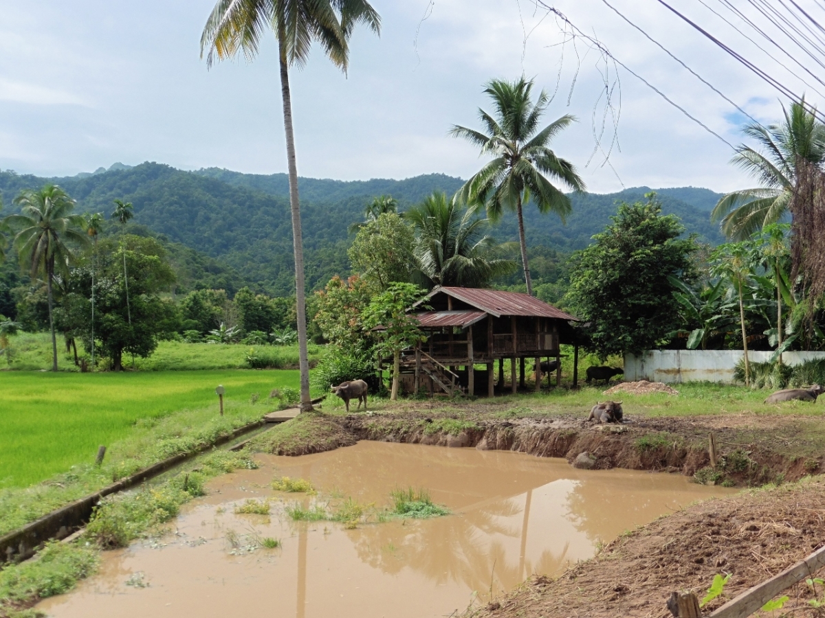Der Pha Suea Wasserfall war dann schon deutlich spektakulärer, vor allem weil schon die Fahrt dorthin von einer traumhaft-malerischen Landschaft aus Reisfeldern und Urwald geprägt war. Die Dame vom Rollerverleih hatte uns zwar auf Grund des Regens verboten den steilen Berg mit dem kleinen 110cc Roller zu befahren, aber wir probierten es glücklicherweise trotzdem, denn wie sich herausstellte hatte sie maßlos übertrieben. Auf dem Weg zurück legten wir dann noch einige Zwischenstopps in den Reisfeldern ein, absolutes Highlight hier war die „Bamboo Bridge“ mit dazugehörigem Tempel. Außerdem besichtigten wir zum Sonnenuntergang noch den Tempel auf dem Berg in Mae Hong Son.
