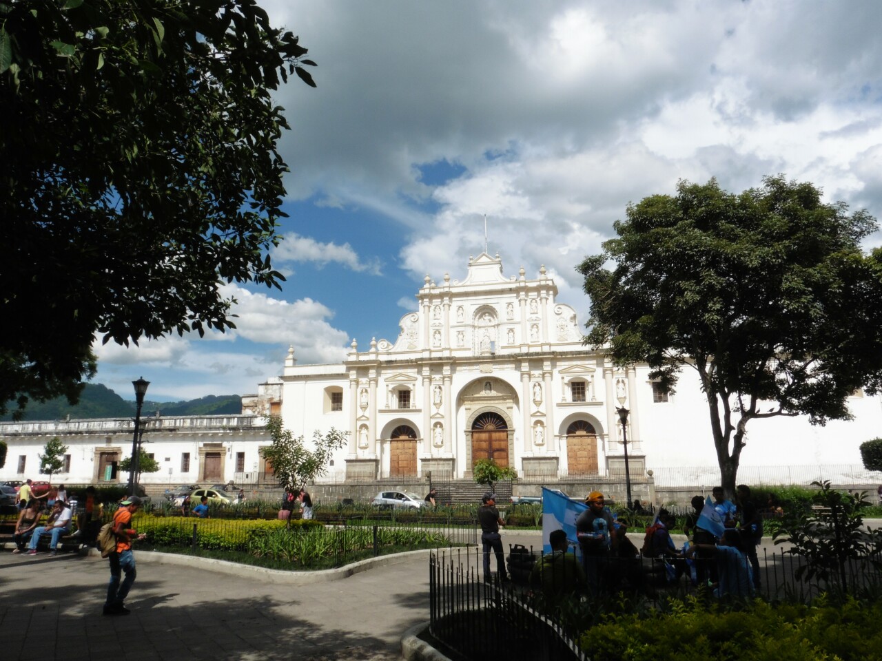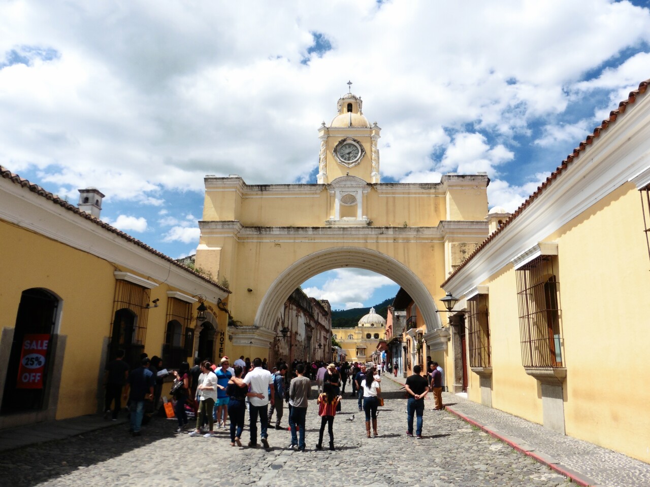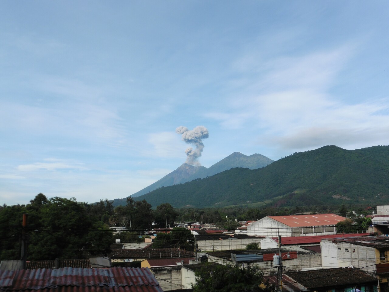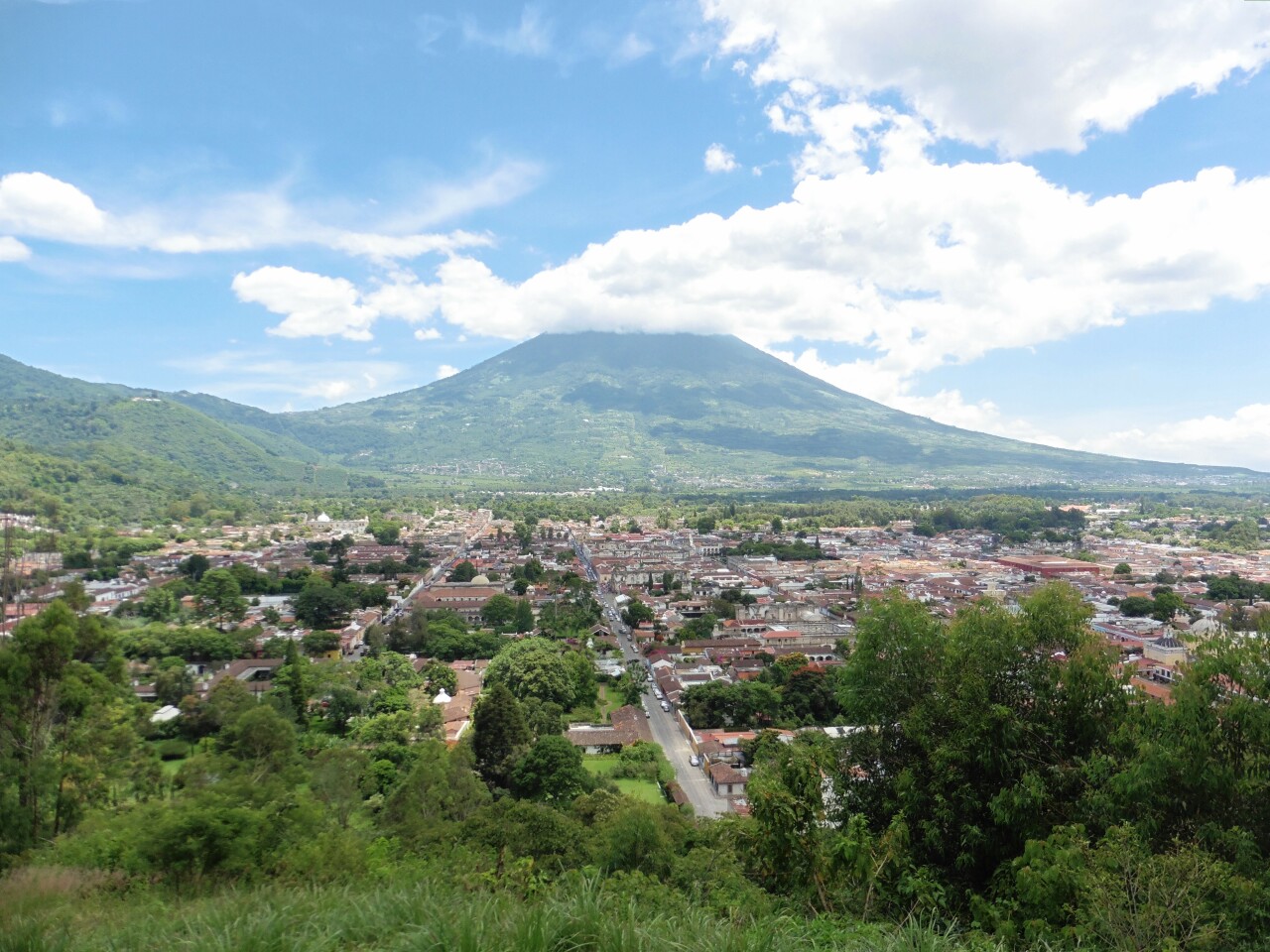 DIe Fahrt von Lanquin nach Antigua war bei Weitem die unangenehmste Fahrt bisher. Keine Klimaanlage, Kurven ohne Ende und ein leicht irrer Fahrer. Dazu noch mitten durch Guatemala City, welches auf Grund der vielen Chicken-Busse (alte amerikanische Schulbusse, welche als öffentlicher Nahverkehr umfunktioniert sind) einfach nur nach Diesel stinkt Aber irgendwann kamen wir dann doch an und die Stadt liegt wirklich unglaublich schön eingerahmt von drei Vulkanen (zwei davon aktiv).